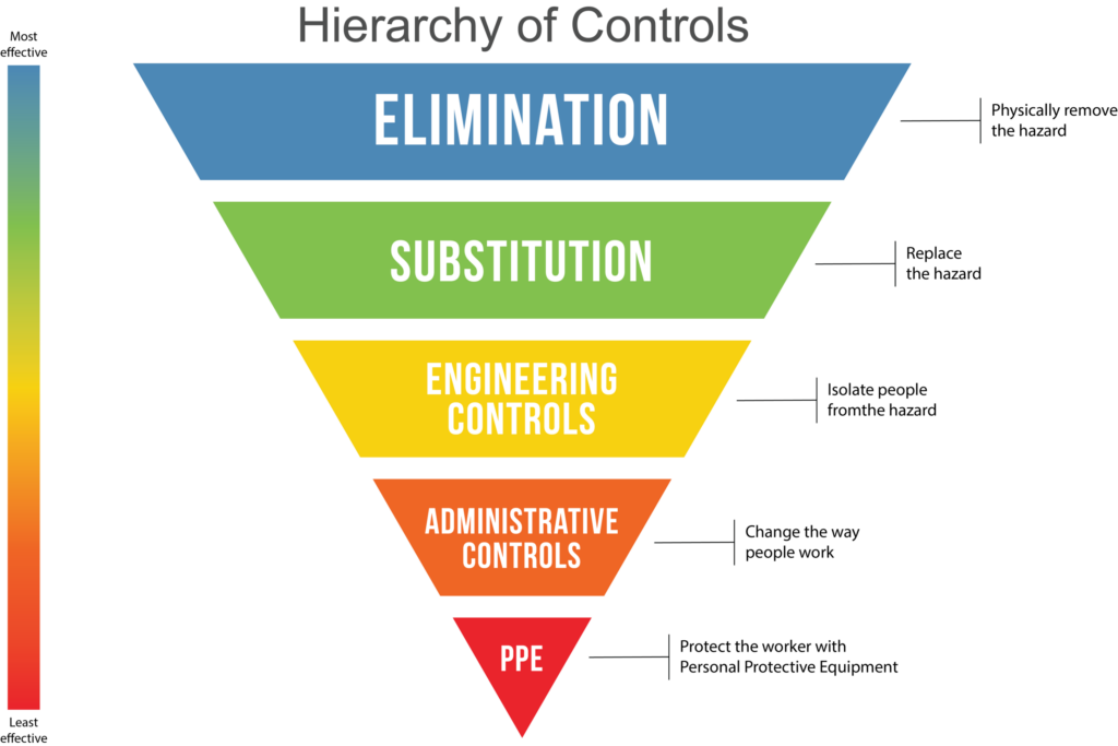 The Hierarchy of Control consists of five levels, arranged from the most effective to the least effective control method. The principle is clear: